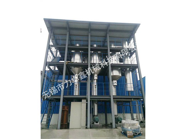 工作原理:四效降膜蒸發(fā)器需濃縮的料液由泵送入加熱管頂部,沿著加熱管內(nèi)壁形成液膜向下流動。在這個過程中,由于管外的加熱,管內(nèi)液膜開始沸騰并部分蒸發(fā)
